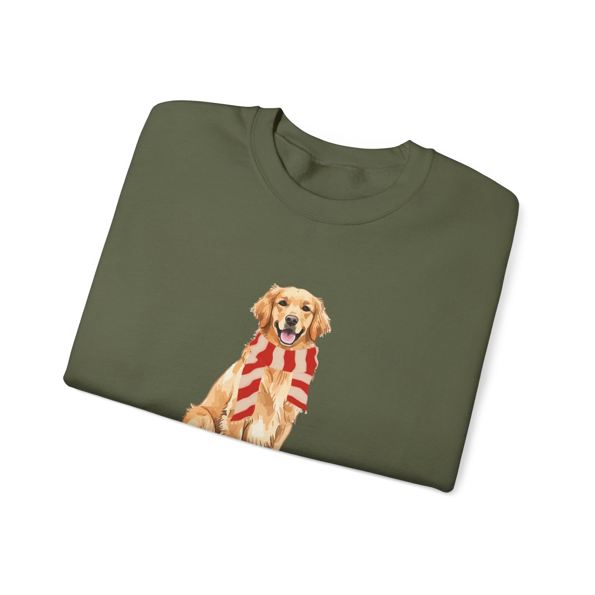 A cozy crewneck sweatshirt featuring a golden retriever wearing a scarf design, perfect for dog lovers. This sweatshirt is ideal for casual wear during the fall and winter seasons, bringing a warm and cheerful vibe to your wardrobe. It is relevant for pet lovers, dog owners, and anyone looking for a cute and comfortable sweatshirt to wear during the holidays or chilly days.